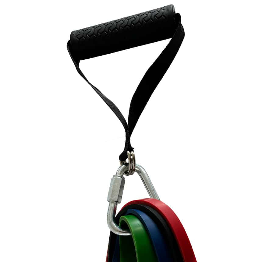 Oversized and ultra-strong carabiners safely accommodate multiple large resistance bands at once without deformation.