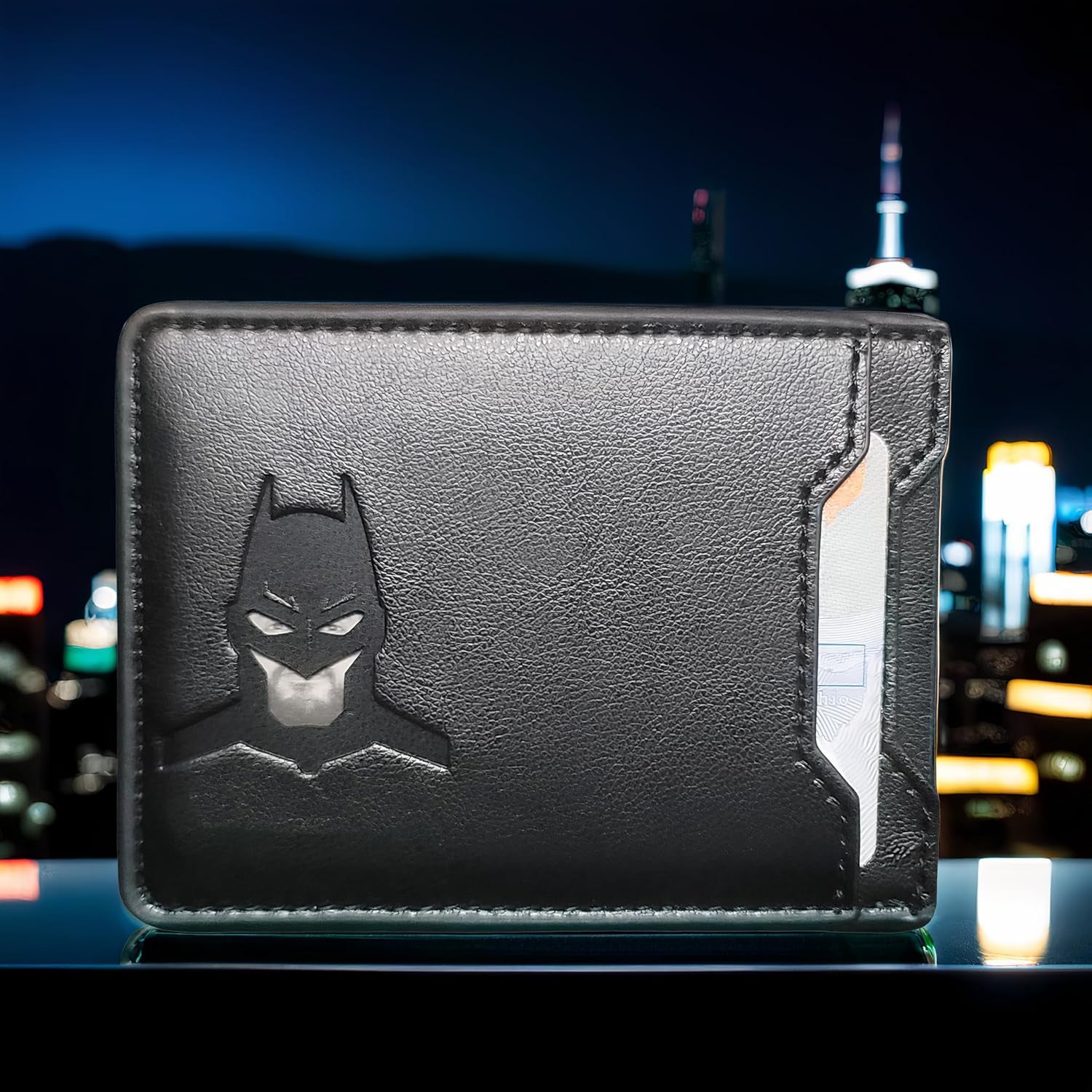 Embossed bat mask detail adds bold, heroic character. Stands out from ordinary wallets with unique style.