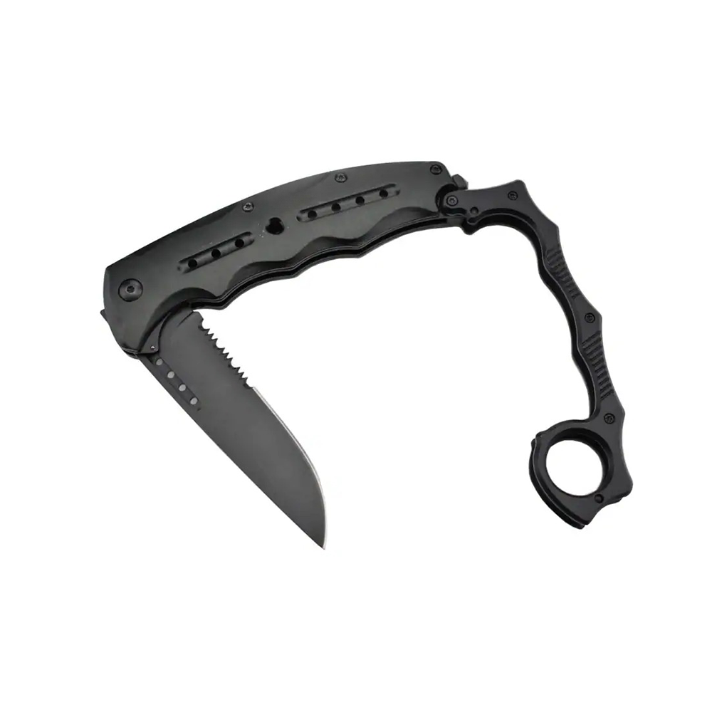 The Black Anodized Aluminum Knuckle Knife is a robust, tactical-grade tool designed for demanding use and personal preparedness. This compact yet powerful knife integrates a durable knuckle guard handle made from black anodized aluminum, a sharp 95mm steel serrated blade, and a spring-assisted opening mechanism. Featuring additional utility components like a window breaker and a belt clip, it offers rapid deployment, secure handling, and versatile functionality in a discreet package, making it suitable for tactical, outdoor, and emergency scenarios.
