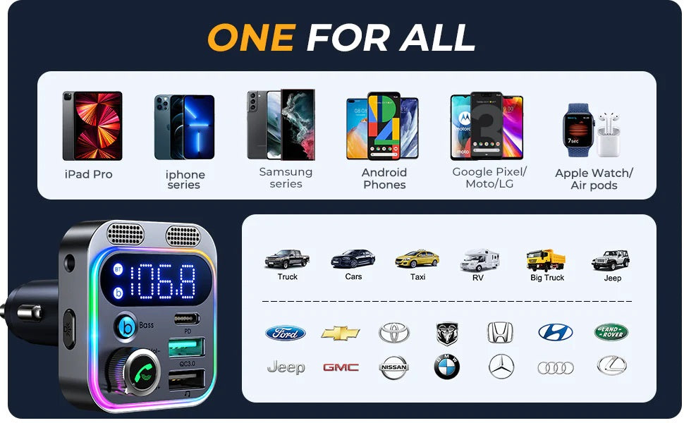 Equipped with a PD 30W Type-C port and a QC 3.0 18W USB charging port, this car adapter allows you to charge two devices simultaneously at lightning speed. It supports fast charging for various devices, including Samsung Super Fast Charging, iPad Pro, iPhone, Google, Motorola, LG, and Android devices. The 48W output ensures faster charging than most other Bluetooth car adapters on the market.