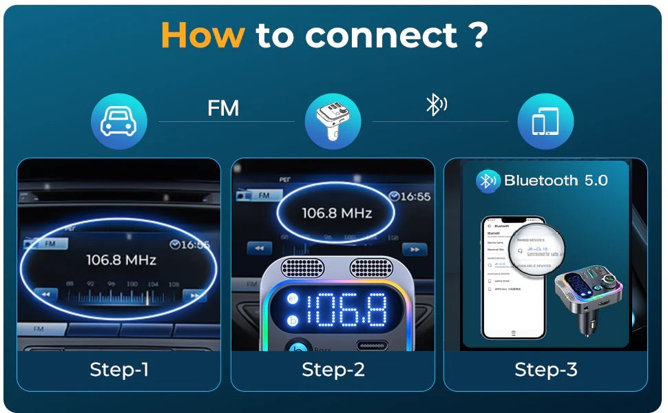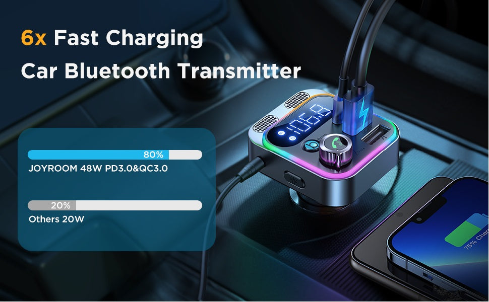 This multi-functional car adapter combines fast charging, Bluetooth connectivity, FM transmission, and clear hands-free calling into one convenient device. Supporting 48W power output, this car adapter is perfect for charging multiple devices while enjoying high-quality music and hands-free calls. With Bluetooth 5.0 technology, dual microphones for clearer communication, and a rich Hi-Fi bass experience, it’s designed to enhance your driving experience.